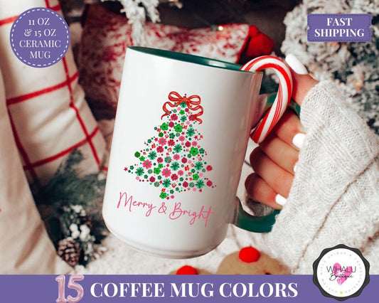 Cute Merry & Bright Christmas Mug Flower Tree Holiday Coffee Cup Xmas Tree Festive Gift For Her Christmas Coquette Bow Hot Cocoa Mug